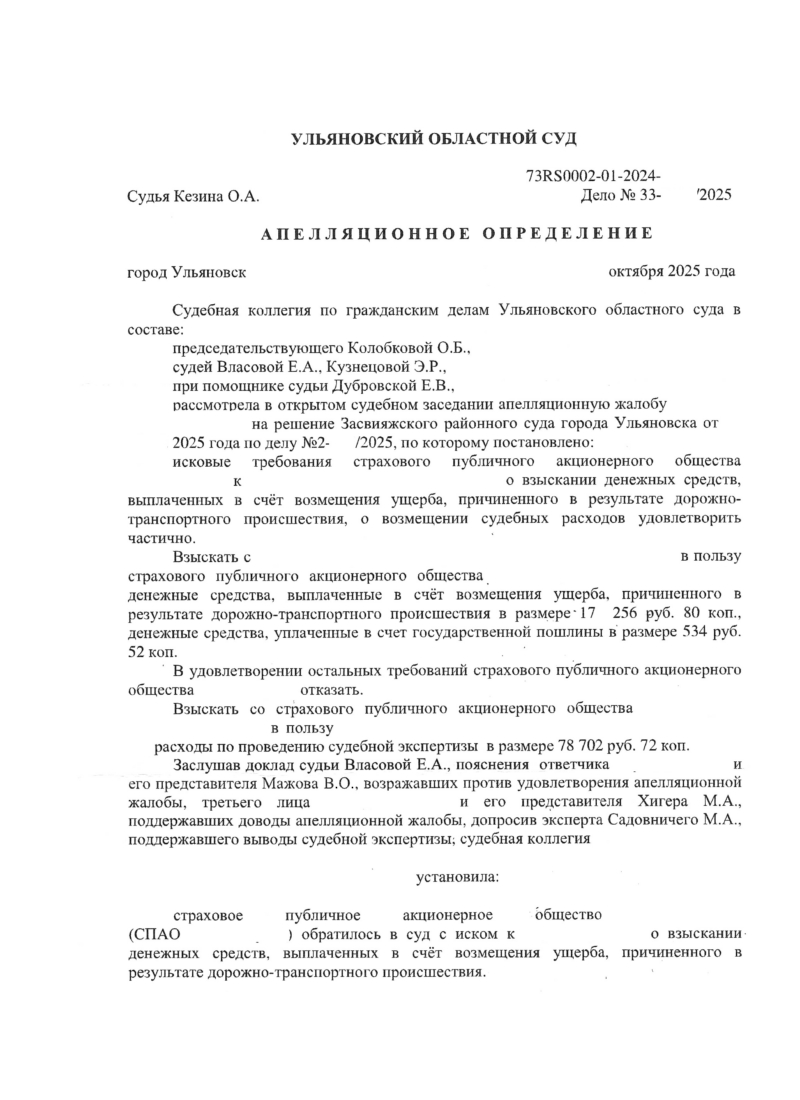 - Судья Засвияжского районного суда г. Ульяновска изучив материалы дела вынесла законное решение, из которого следовало, что суд пришел к обоснованному выводу о том, что действия обоих водителей в равной степени привели к ДТП, применив процентное соотношение вины 50% на 50% и взыскав с моего Клиента денежные средства в сумме 17 256 руб. 80 коп. (указанная сумма в 25 раз меньше суммы заявленной страховой компанией).