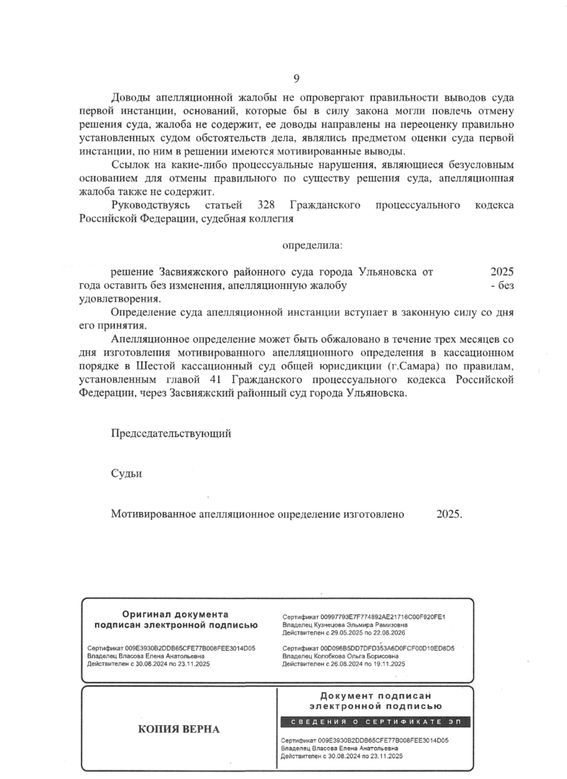 - Ульяновский областной суд по результатам рассмотрения апелляционной жалобы «Потерпевшего» полностью согласился с выводом суда первой инстанции, оставив решение суда без изменения, подчеркнув, что причиной возникновения опасной ситуации и, как следствие ДТП, стали неверная оценка дорожной ситуации водителями обоих автомобилей.