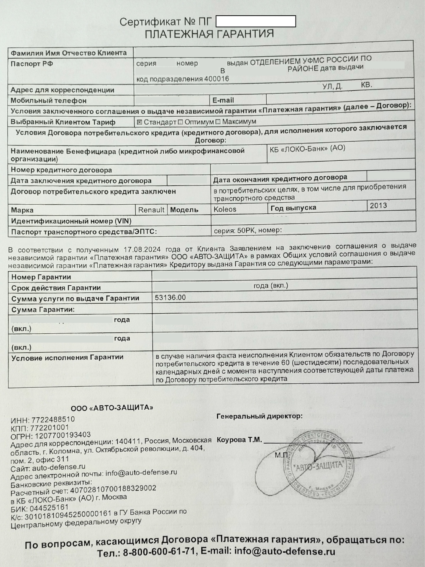 Клиенту навязали его в автосалоне г. Москвы при оформлении автокредита в КБ ЛОКО-Банк. Стоимость гарантии составила 53 136р. Нами была направлена досудебная претензия в адрес ООО «Авто-Защита», но компания вернуть деньги отказалась.