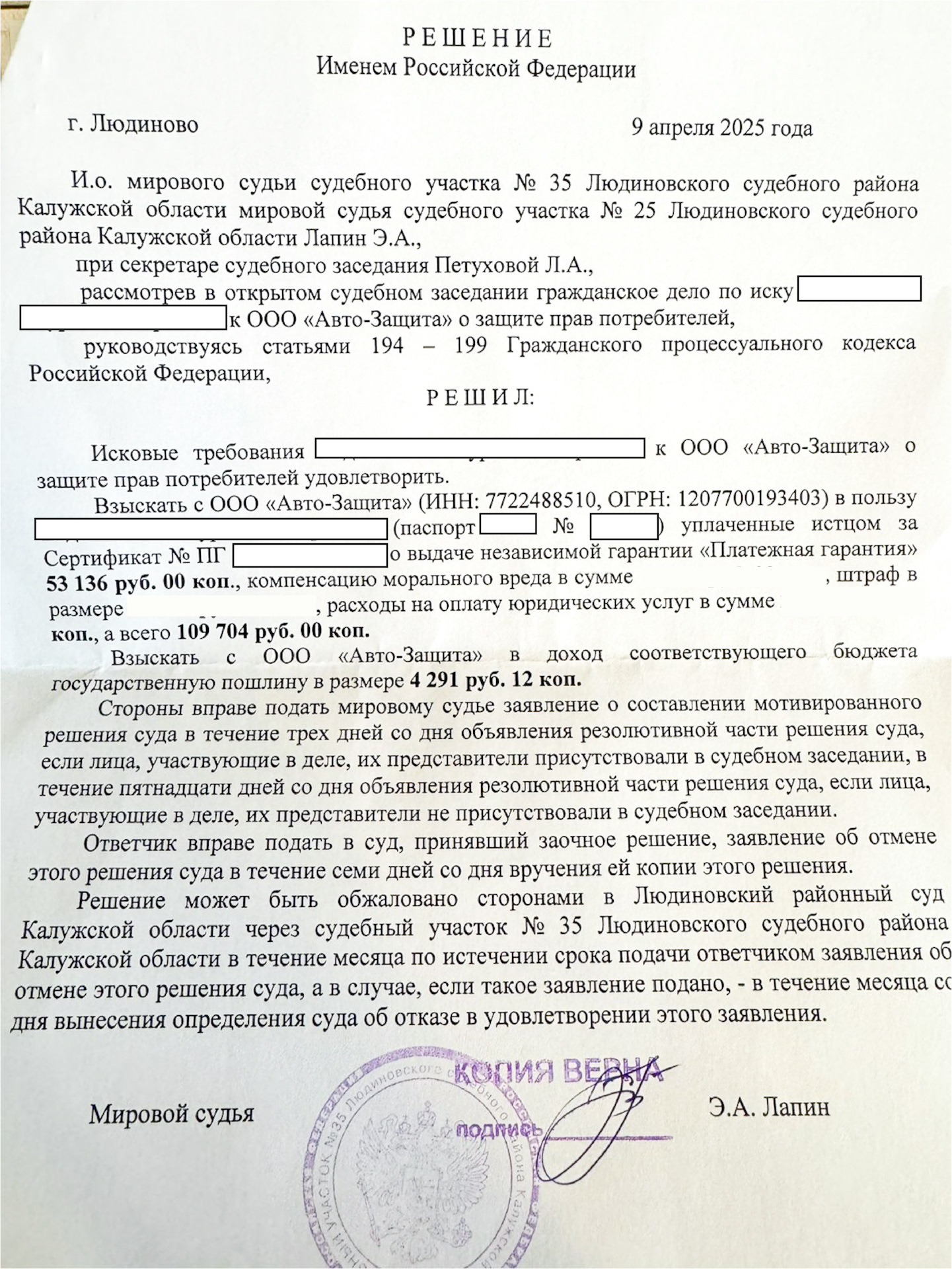 По делу было 4 заседания и в итоге суд решил взыскать стоимость этой гарантии, штраф, компенсацию морального вреда и расходы на юридические услуги.