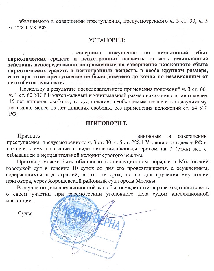 Клиенту грозило от 15 до 20 лет лишения свободы по наиболее тяжкому составу преступления — покушению на сбыт наркотиков в особо крупном размере по ч. 3 ст. 30, ч. 5 ст. 228.1 УК РФ. Результатом профессиональной защиты стало назначение наказания 7 лет л.с. вместо минимум 15, что более чем в 2 РАЗА! меньше, чем нижняя граница санкции!