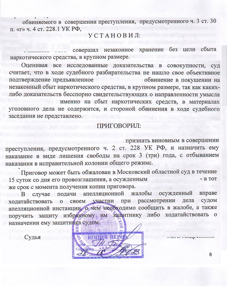 Обвинение клиента в покушении на сбыт наркотиков в крупном размере по п. «г» ч. 4 ст. 228.1 УК РФ было разбито в суде благодаря изначально верно выбранной позиции. Суд переквалифицировал действия подзащитного на хранение наркотиков по ч. 2 ст. 228 УК РФ, в результате чего назначено наказание по нижней границе — 3 года л.с.