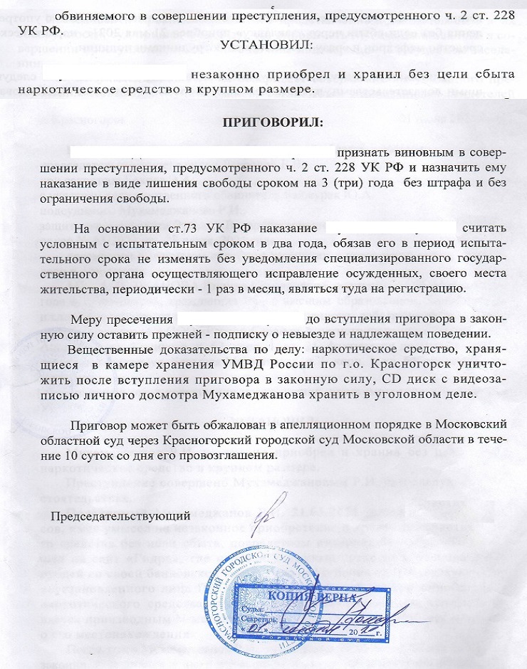 Клиент обвинялся в тяжком преступлении, за приобретение и хранение наркотиков в крупном размере по ч. 2 ст. 228 УК РФ ему грозило реальное лишение свободы на срок от 3 до 10 лет, как и предусматривает санкция. В результате грамотных методов защиты, адвокат убедил суд в отсутствии необходимости реального отбывания наказания и назначении минимального условного срока 3 года.