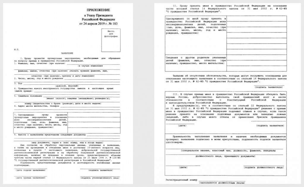 заполненный бланк на приобретение российского гражданства;