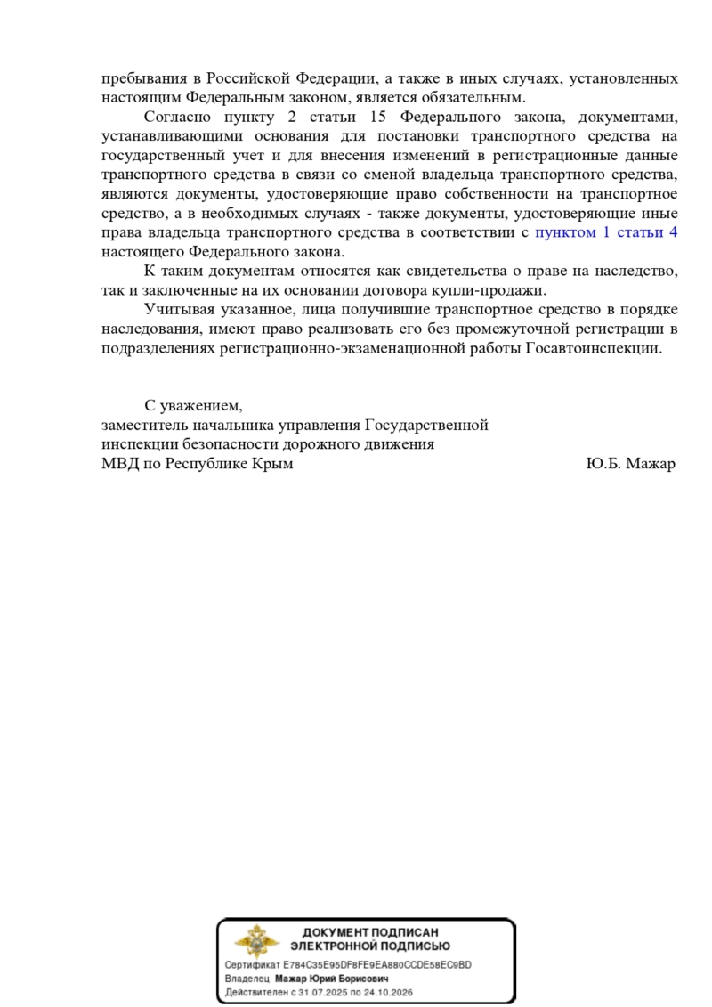 Чтобы дать точный и официальный ответ, я обратился в ГИБДД. Итог удивил многих: да, автомобиль, полученный по наследству, можно не оформлять на себя, а сразу передать новому владельцу. Это прямо разрешено законом, что подтверждает присланный мной официальный ответ.
