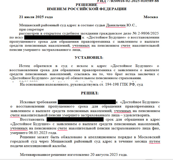 ✅ Если же срок подачи заявления пропущен, существует возможность восстановления пропущенного срока через суд. Это особенно актуально, когда наследники не знали о наличии пенсионных накоплений или узнали позже установленного законом шестимесячного периода.
