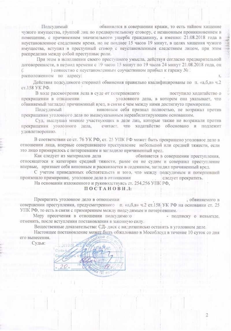 Уже в суде, я как адвокат и представитель стороны защиты, вступил с потерпевшим в переговоры. Пришлось, что называется на пальцах ему объяснять как обстоят дела с совершенным преступлением и причиненным ущербом. Решающим был довод, что подзащитный готов добровольно возместить всю сумму ущерба в настоящий момент. Наконец, потерпевший согласился принять возмещение от доверителя и примириться.