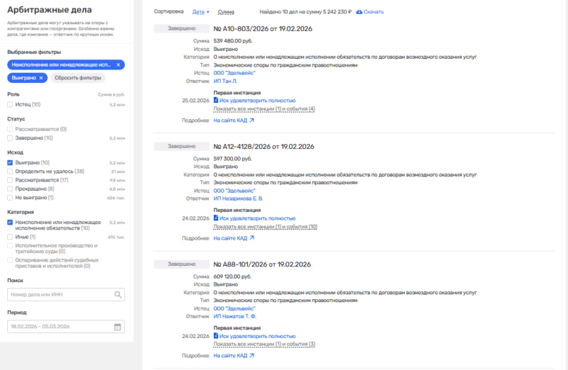 Суд в Коми указал, что взыскатель учреждён 29.12.2025, а по данным Картотеки арбитражных дел с 18.02.2026 по 26.02.2026 он подал в арбитражные суды субъектов РФ более семидесяти аналогичных заявлений к индивидуальным предпринимателям, с однотипными по форме договорами и актами, причём в ряде случаев договорная подсудность «уводила» спор в регион, не совпадающий с местом регистрации сторон. По моему мониторингу КАД на этом же отрезке речь идёт примерно о 74 делах в разных регионах, то есть это не единичная процессуальная история, а поток.