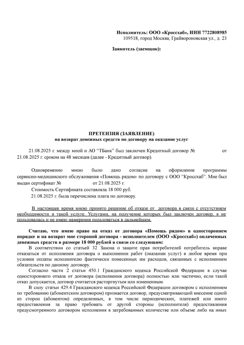 Вернуть деньги за навязанный консультационный сертификат ООО «Кроссхаб» – это законная и реализуемая на практике процедура. Не позволяйте сложным формулировкам в договорах или устным угрозам менеджеров сбить вас с толку. Залог успешного возврата средств кроется в оперативности ваших действий, строгом соблюдении юридической процедуры и ведении всей коммуникации с компанией исключительно через заказные письма с описью вложения. Закон полностью на вашей стороне.