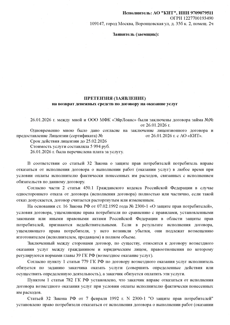 Возврат денег за лицензионный договор с АО «КИТ» — задача непростая из-за специфики «цифрового» товара, но вполне реальная. Навязывание услуги, отсутствие фактического использования и грамотно составленная претензия — ваши главные инструменты.