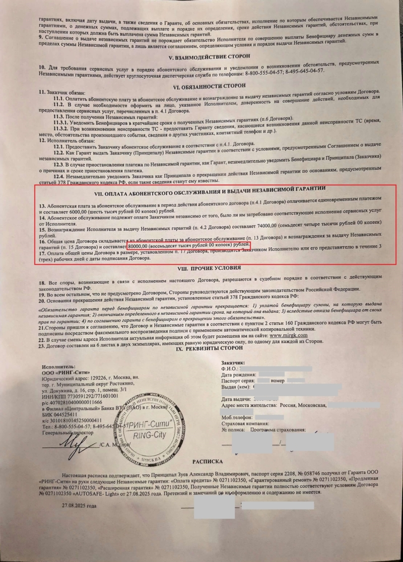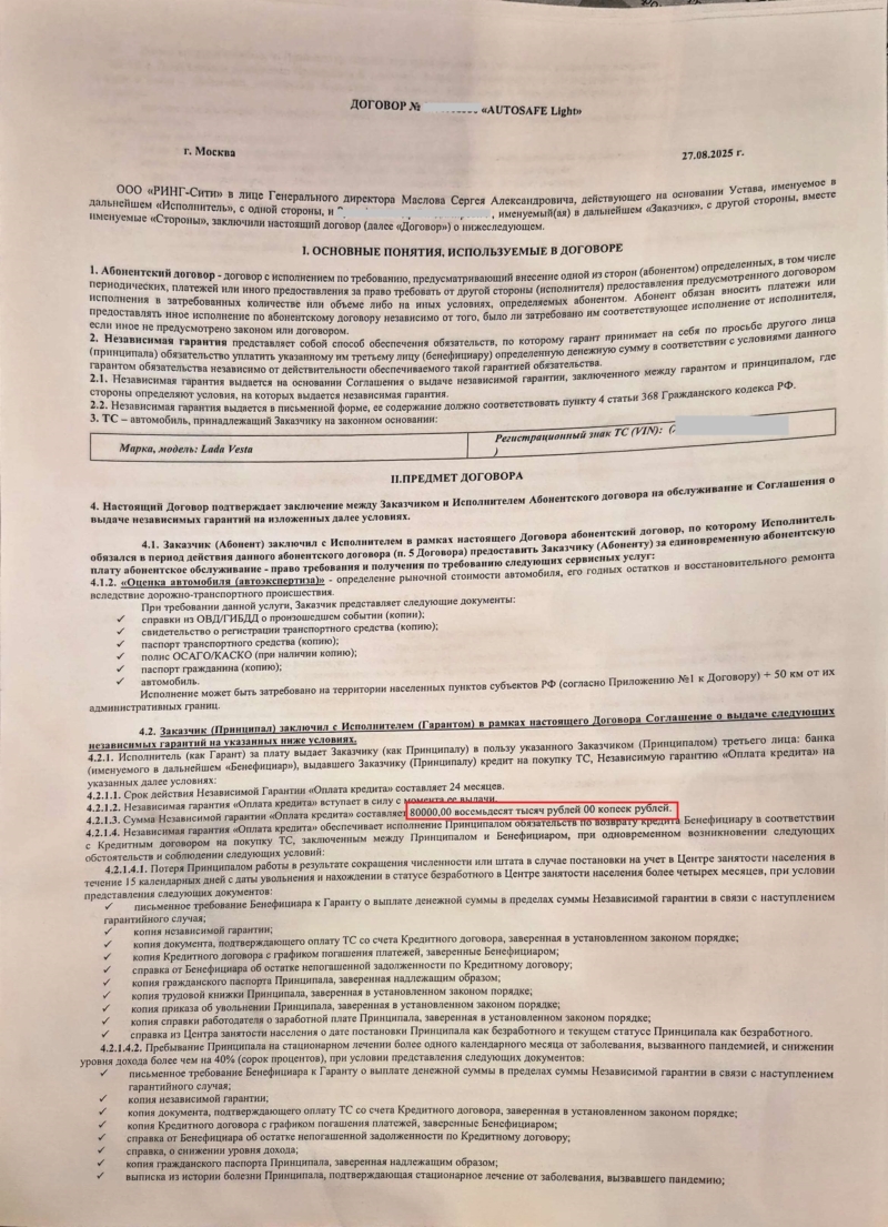 При оформлении автокредита дополнительно навязали услугу — независимую гарантию «AUTOSAFE Light», оформленную ООО «Ринг-Сити» от 27.08.2025 г.