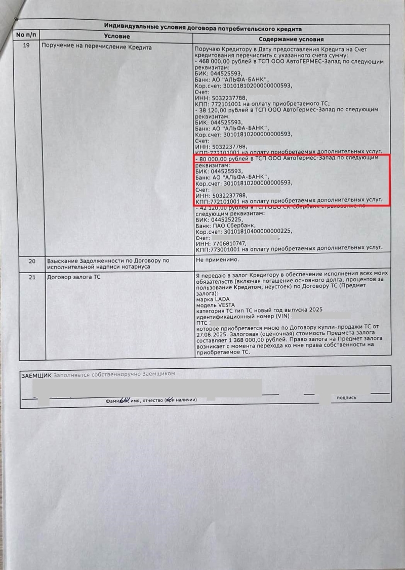 📅 Между клиентом и ПАО «Сбербанк» (автосалон ООО «АвтоГЕРМЕС-Запад», г. Москва) был заключён кредитный договор.