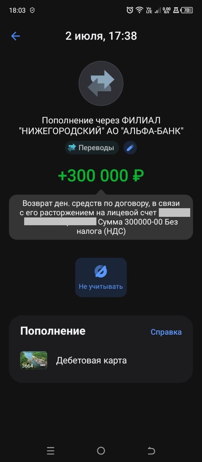 Итог: возврат 300 000 ₽ произведён в полном объёме.