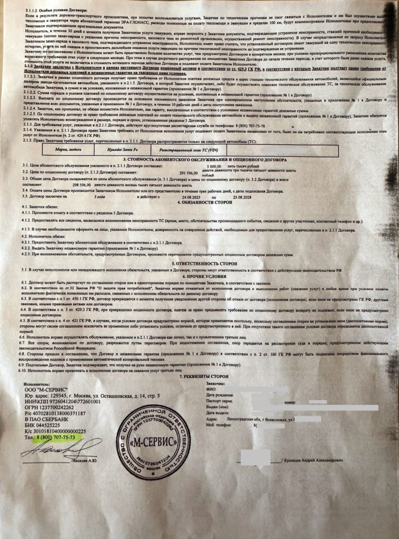 - Доп. услуга: договор Platinum от ООО «М-Сервис» от 24.08.2025 г.