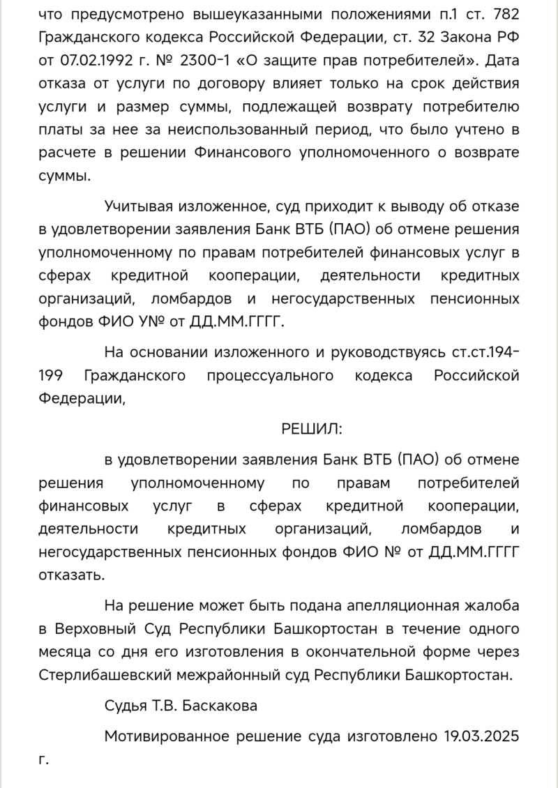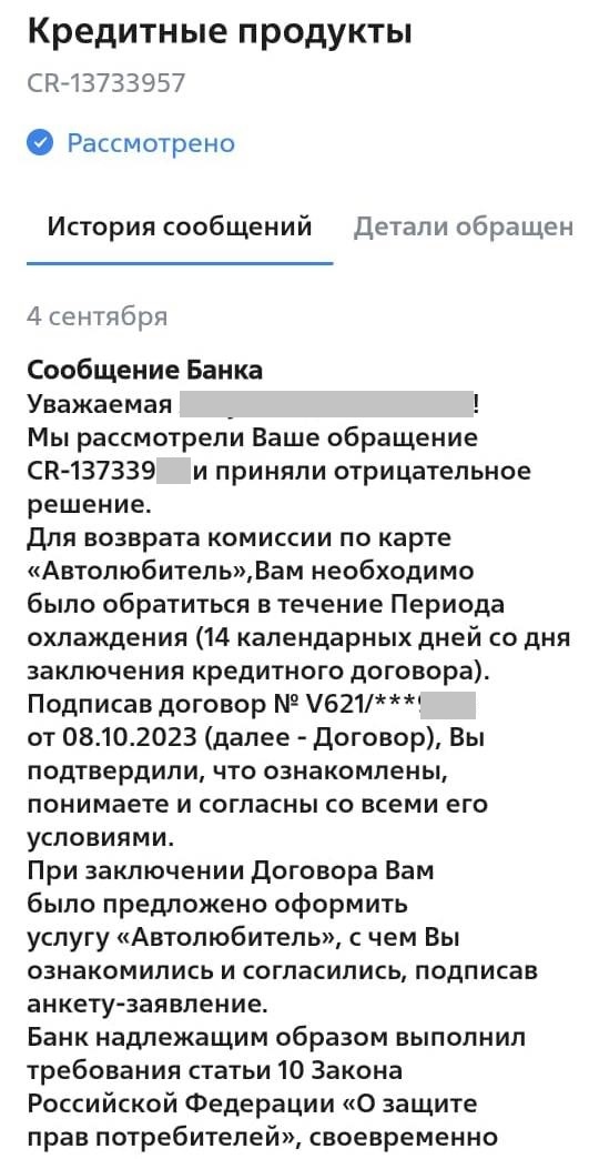⛔ Банк отказал, затем направлено повторное обращение по форме финансового уполномоченного.