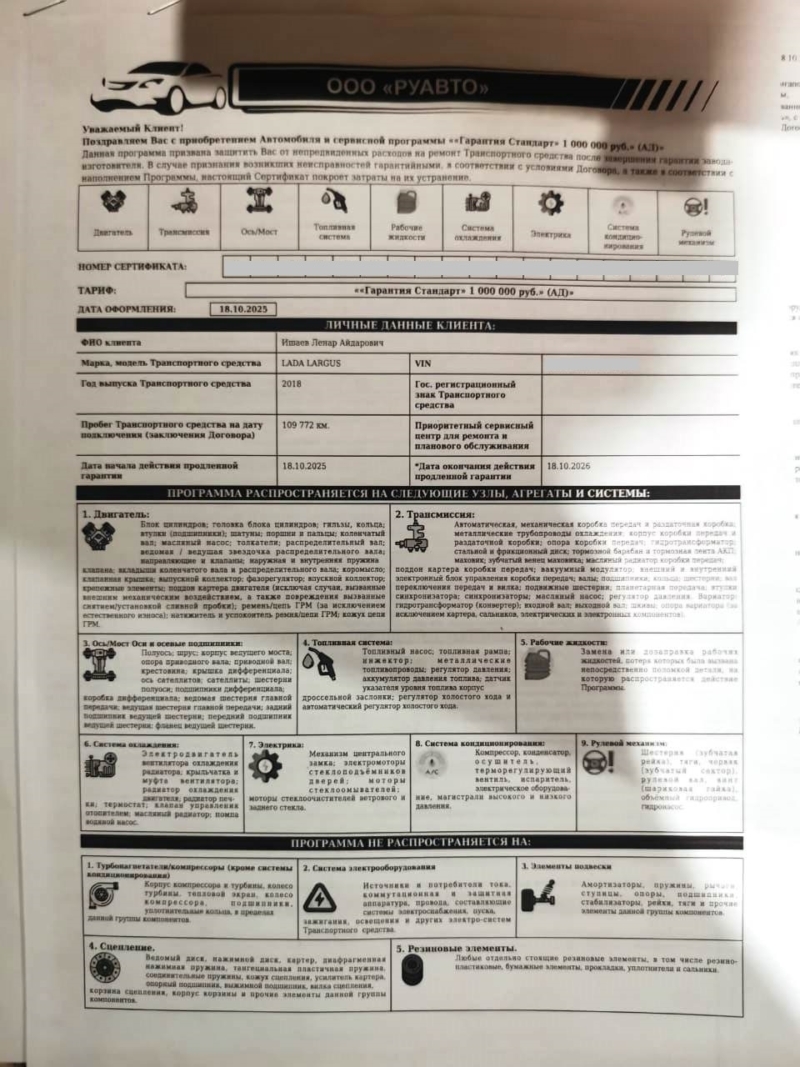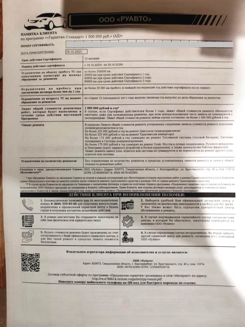 - ООО «РУАВТО» — сертификат «Гарантия стандарт 1 000 000 ₽», стоимость 150 000 ₽