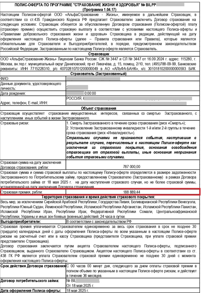 ✅ Кейс 2. МФК «Альфа Финанс»: возврат 188 889 ₽ по навязанной страховке жизни