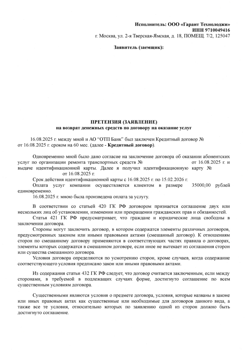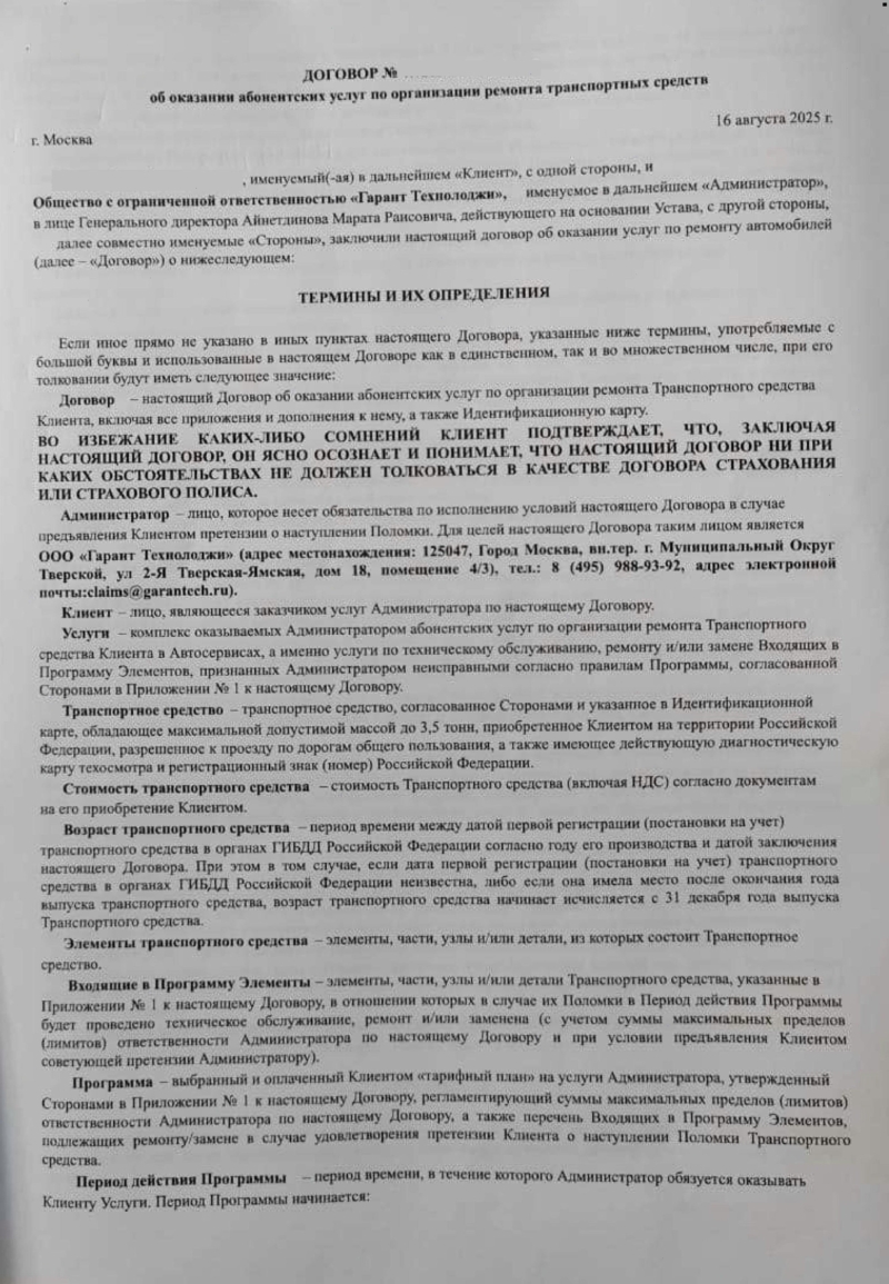 Покупка автомобиля в кредит почти всегда сопровождается целой стопкой дополнительных документов. Среди них нередко оказывается договор абонентского обслуживания от ООО «Гарант Технолоджи». В момент подписания менеджеры торопят, уверяют, что «без этого банк не одобрит» или «так выгоднее», а уже дома становится понятно – вы переплатили за сервис, которым пользоваться не собираетесь. Хорошая новость в том, что вернуть деньги за такой договор реально, если правильно выстроить действия.