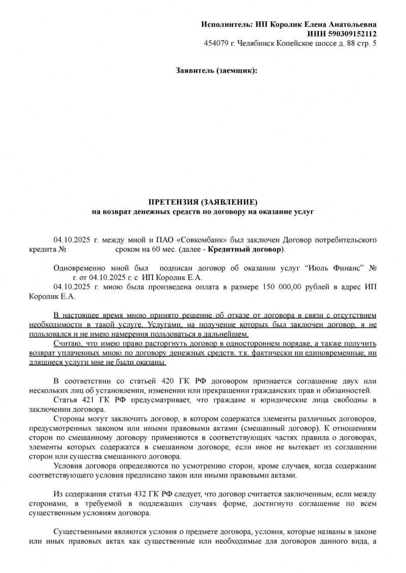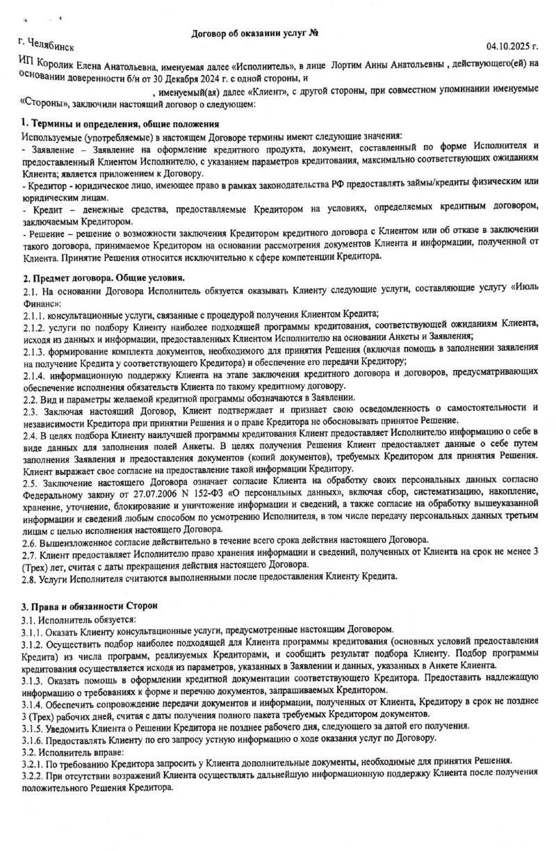 При оформлении автокредита или потребительского кредита заемщикам нередко “рекомендуют” платные услуги посредников по подбору кредитных программ. На словах это “помощь специалиста”, “ускорение одобрения”, “улучшенные условия”, а по факту – отдельный договор и внушительная комиссия. Одна из таких услуг оформляется по договору с ИП Королик Еленой Анатольевной. Ниже разберем, как добиться возврата денег, если эта услуга навязана, не нужна или не принесла ожидаемого результата.
