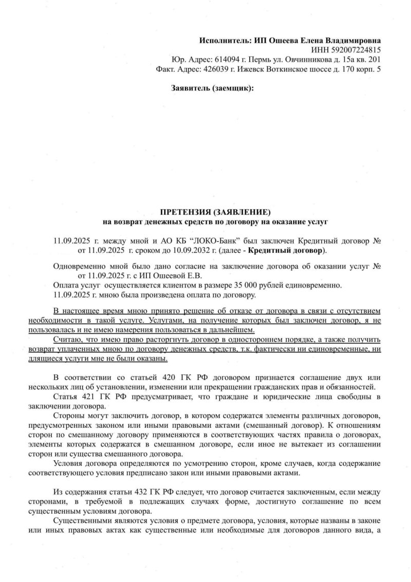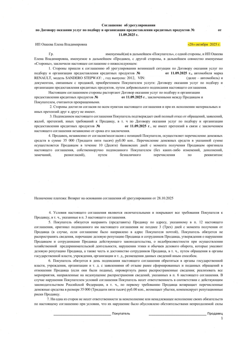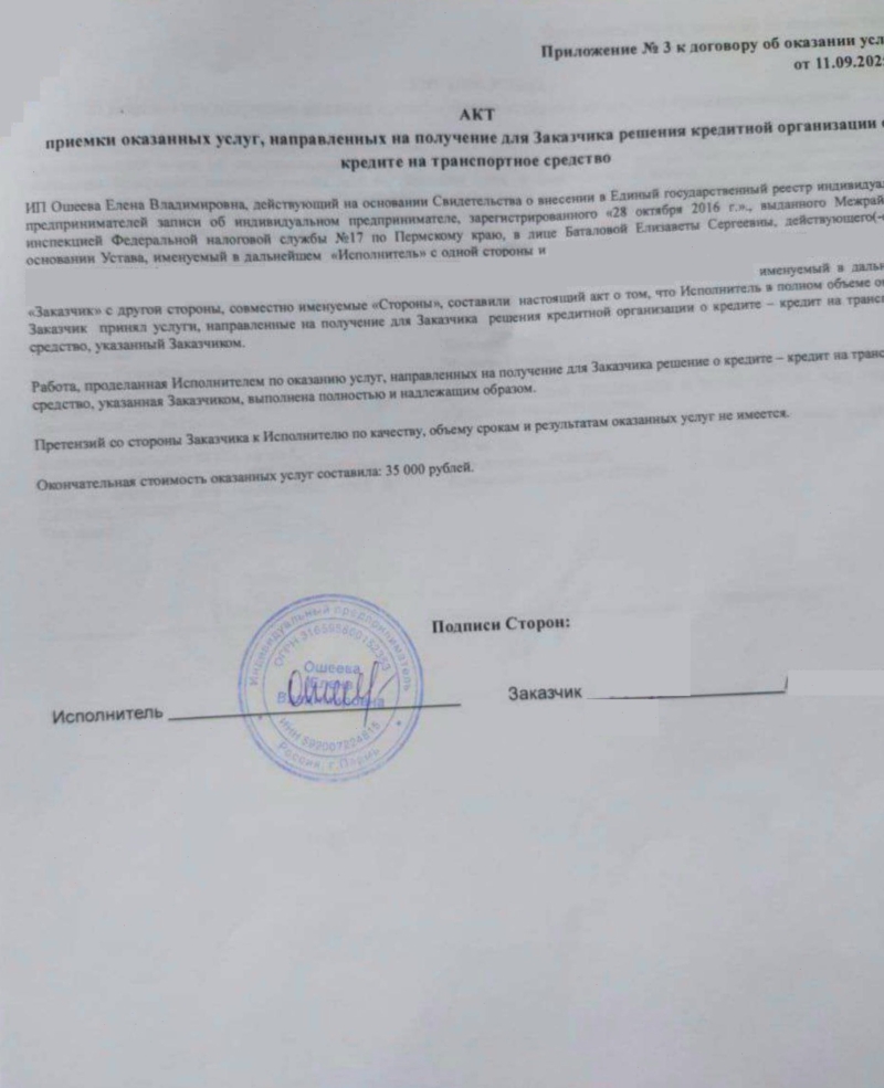 При оформлении автокредита заемщикам нередко предлагают целый набор платных “сервисных” услуг. Одна из них – подбор и организация предоставления кредитных продуктов через посредника. Часто человек узнает о такой услуге уже после подписания документов, когда видит в договоре отдельную комиссию за помощь посредника. Разберем, как вернуть деньги за услугу ИП Ошеева Елена Владимировна, если она была навязана, не принесла обещанного результата или оказалась просто лишними расходами.