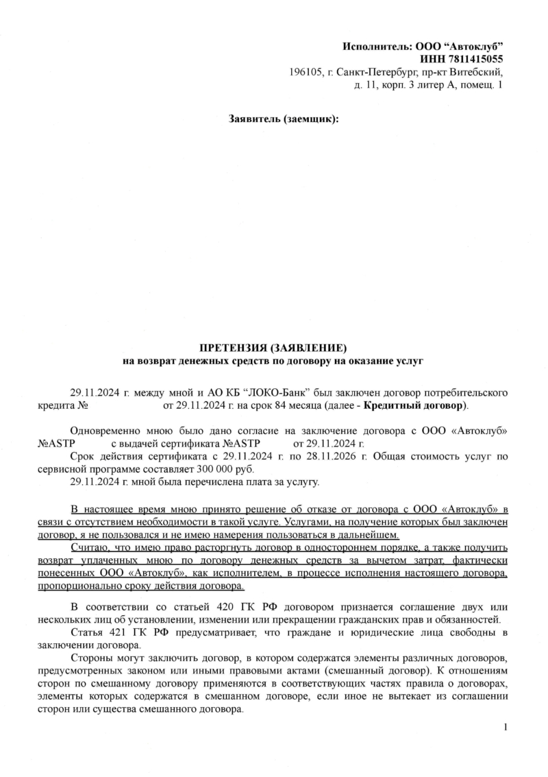Шаг 2. Отправьте заявление в адрес ООО “Автоклуб”