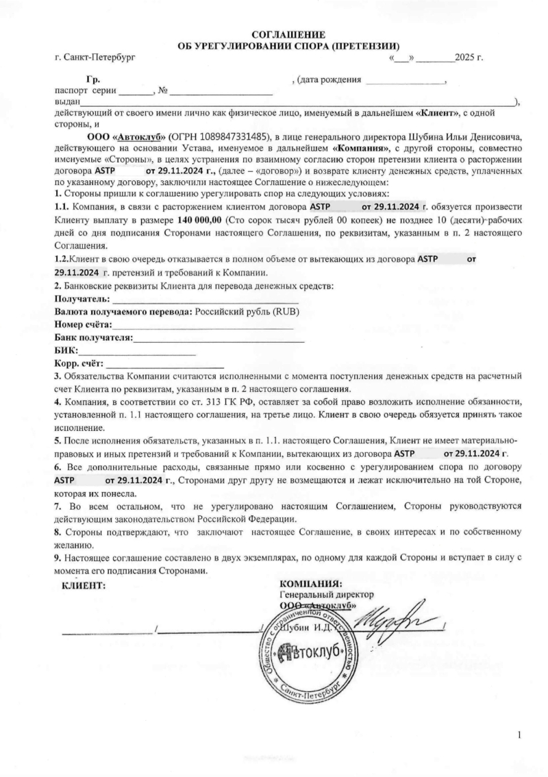 По практике, после того, как “Автоклуб” получает претензию, их специалисты выходит на заемщика с предложением о заключении мирового соглашения. В данном соглашении сумма к выплате на 10-15 тыс. меньше запрашиваемой суммы. Не рекомендуем его подписывать, так как есть возможность получить всю сумму.