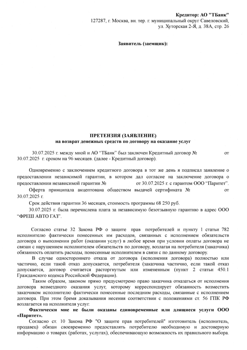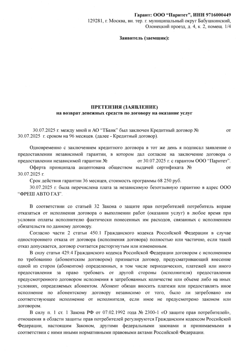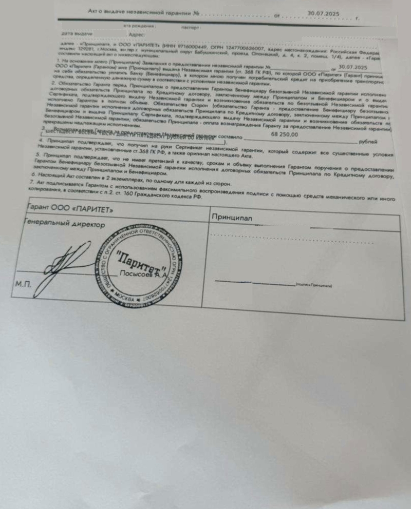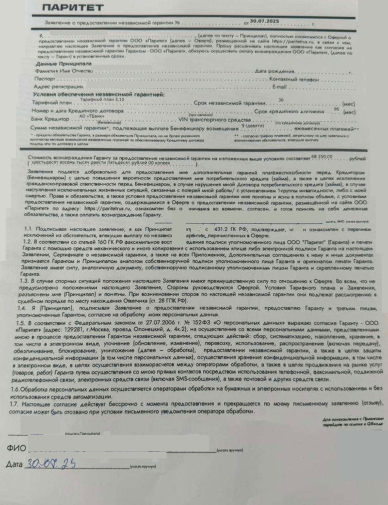 Покупка автомобиля в кредит почти всегда сопровождается предложением “дополнительной защиты” – страховок, гарантий, сервисных пакетов. Одна из таких услуг – независимая гарантия от ООО “Паритет”. Нередко клиент узнает о том, что заплатил за нее десятки или даже сотни тысяч рублей, уже дома, когда спокойно разбирает документы. Ниже разберем, как отказаться от этой услуги и добиться возврата денег, если вы считаете ее навязанной или бесполезной.