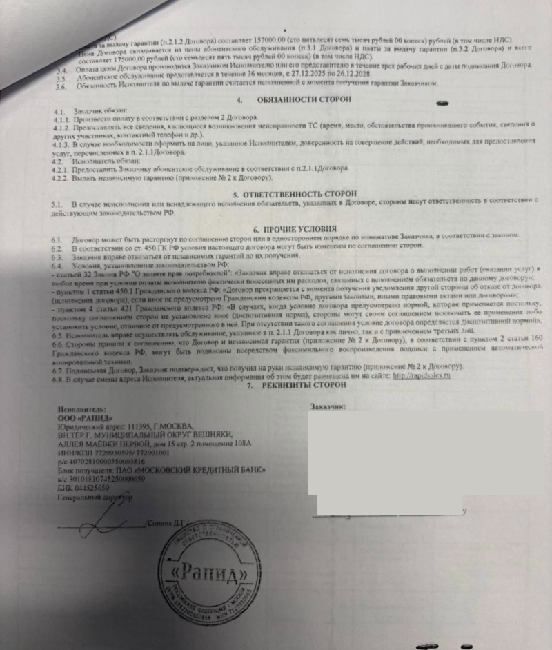 Независимая гарантия от ООО “Рапид” – платная услуга с прописанными условиями, сроком действия и ограничениями. То, что договор оформили одновременно с автокредитом и “в нагрузку” к автомобилю, не лишает вас права отказаться от него. Закон и правоприменительная практика позволяют клиенту расторгнуть договор и вернуть деньги – полностью или частично, в зависимости от ситуации.