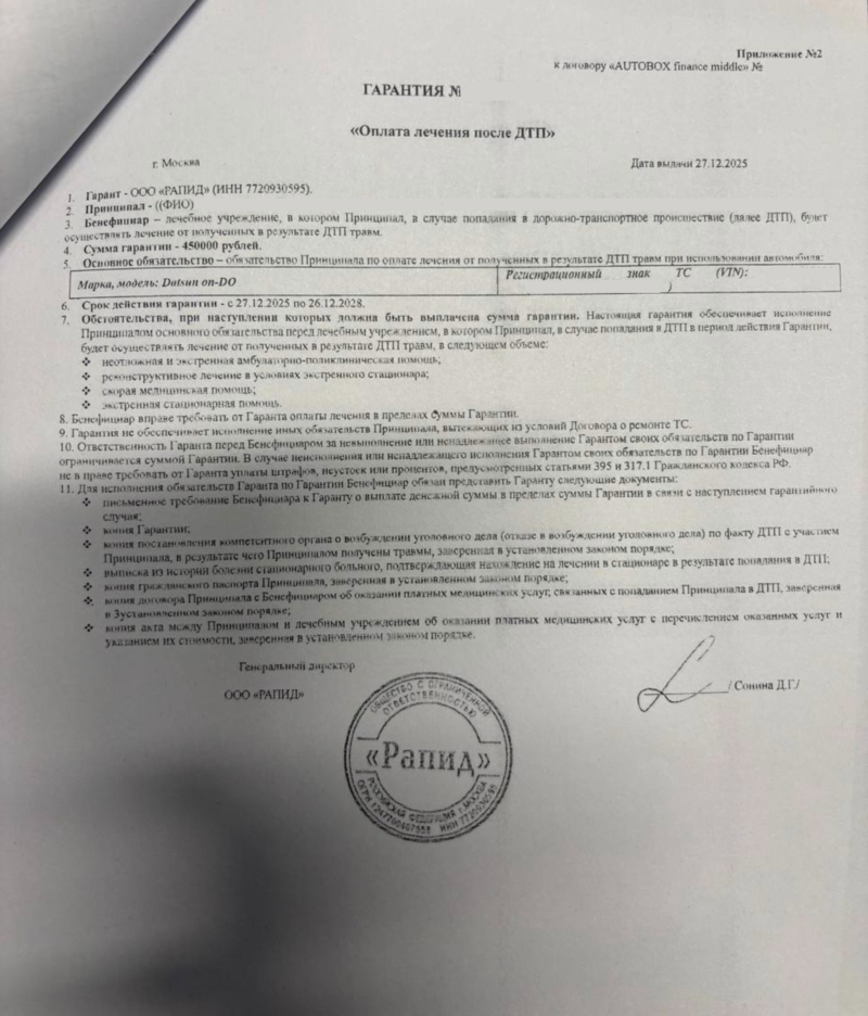 Работа с клиентами строится через типовой договор, который подписывается в автосалоне одновременно с кредитными документами. Подписывая договор и соглашаясь на включение услуги в сумму автокредита, клиент присоединяется к условиям ООО “Рапид”.
