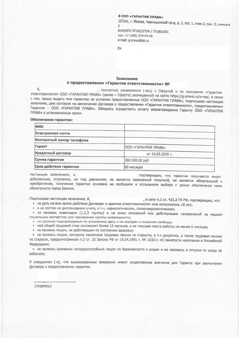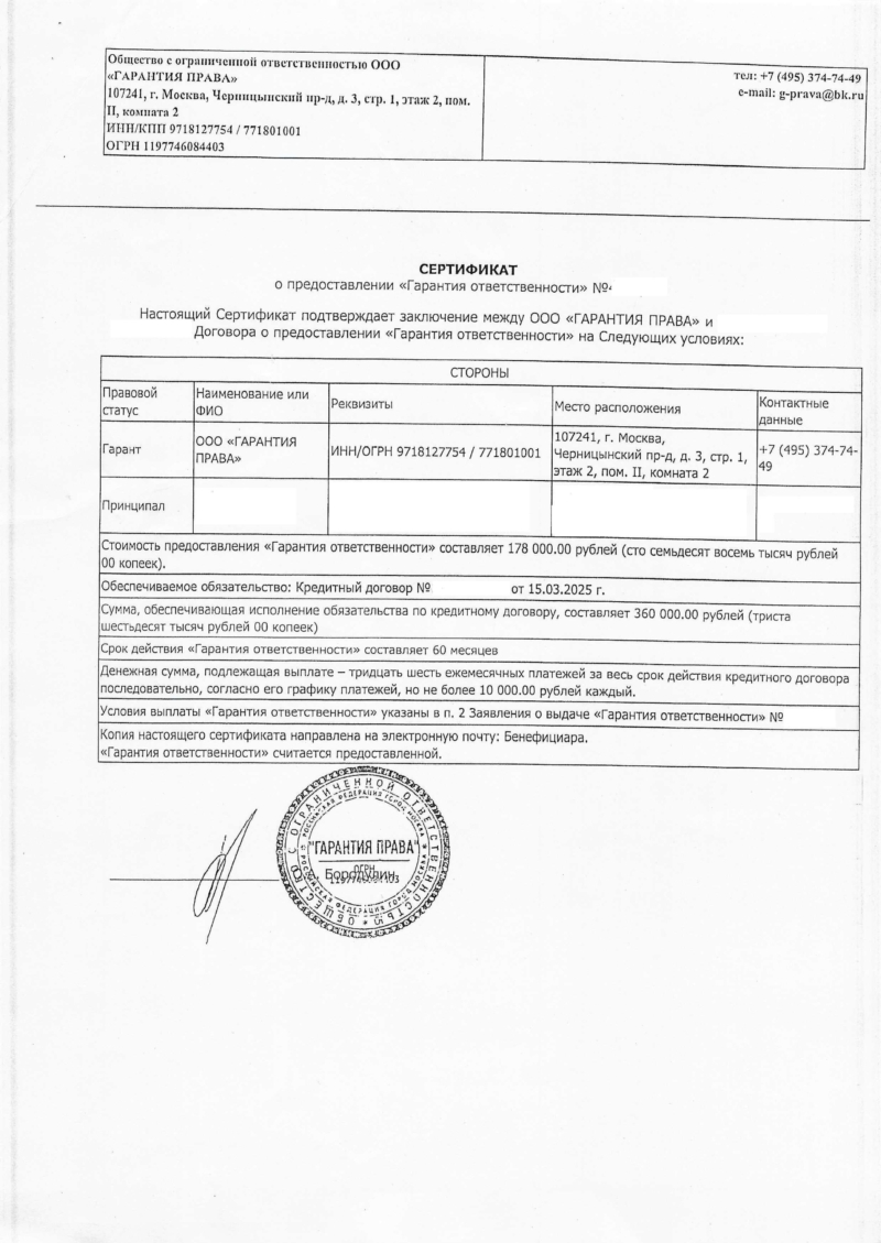 - копию договора или сертификата от ООО “ГАРАНТИЯ ПРАВА”