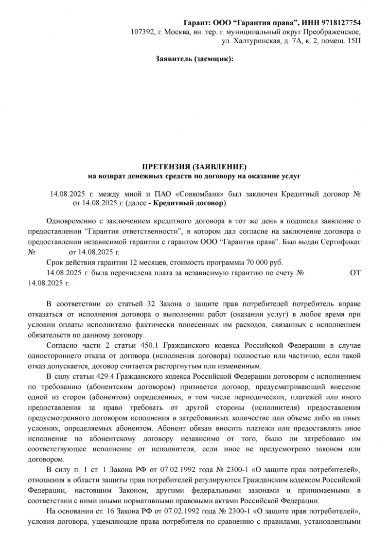 Составьте заявление в адрес ООО “ГАРАНТИЯ ПРАВА”, где укажите: