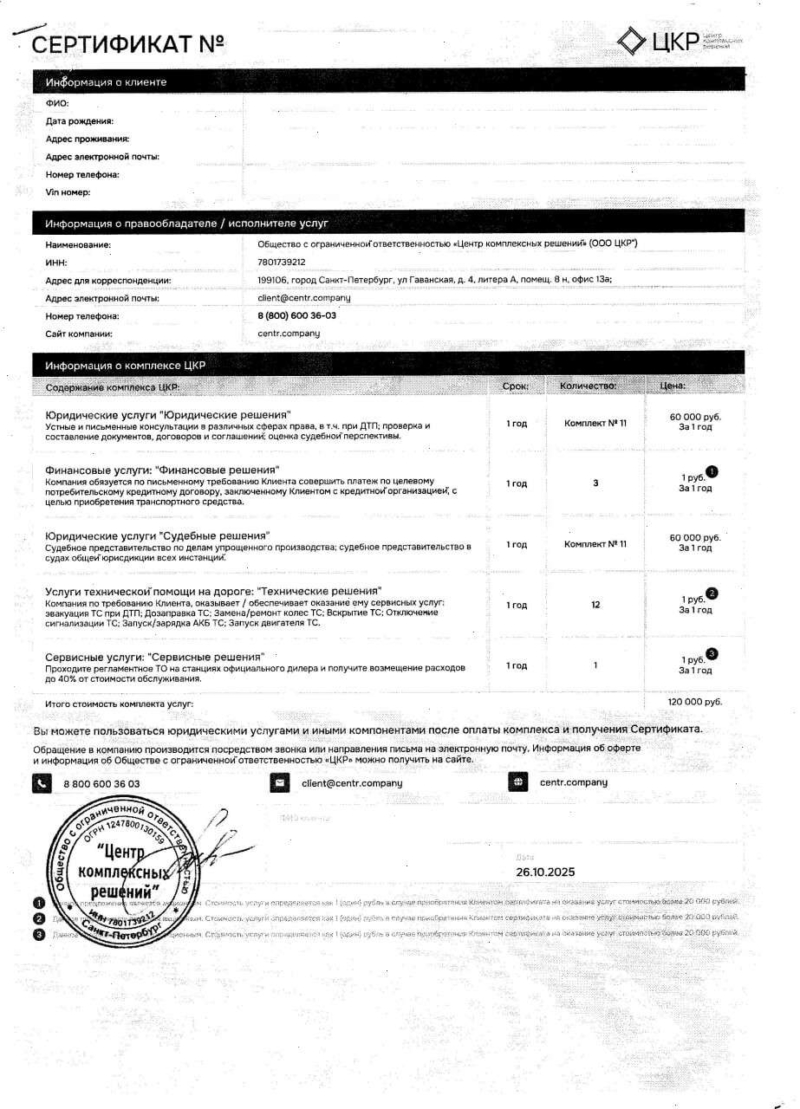 Компания зарегистрирована недавно, в конце 2024 г. Ранее носила наименование “Образовательный центр”, позже сменили на “ЦКР”. Продвигают через партнеров и автосалоны сертификаты на комплексное абонентское обслуживание.