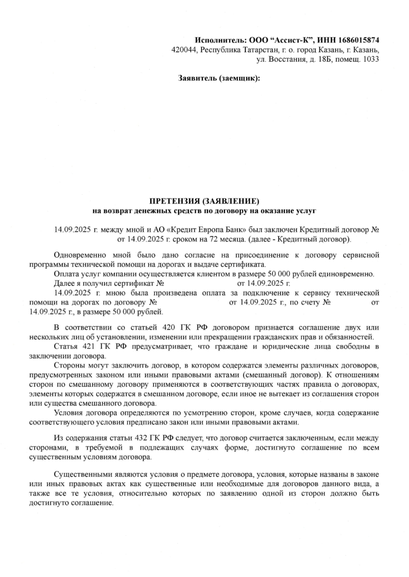 Покупка автомобиля в кредит всё чаще сопровождается навязанными допуслугами – страховками, сервисными пакетами, сертификатами “помощи на дороге”. Одна из таких опций – сертификат “Помощь на дорогах” от ООО “Ассист-К”. Стоит он недёшево, действует ограниченный срок, а воспользоваться им на практике бывает непросто из-за множества условий в оферте. Ниже разберём, как грамотно отказаться от этой услуги и вернуть деньги – полностью в “период охлаждения” или частично после его истечения.