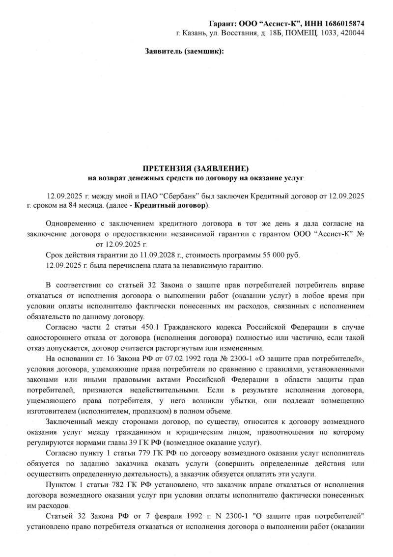по истечении 30 дней с момента направления претензии исполнителю подайте в банк заявление о возврате стоимости навязанной услуги