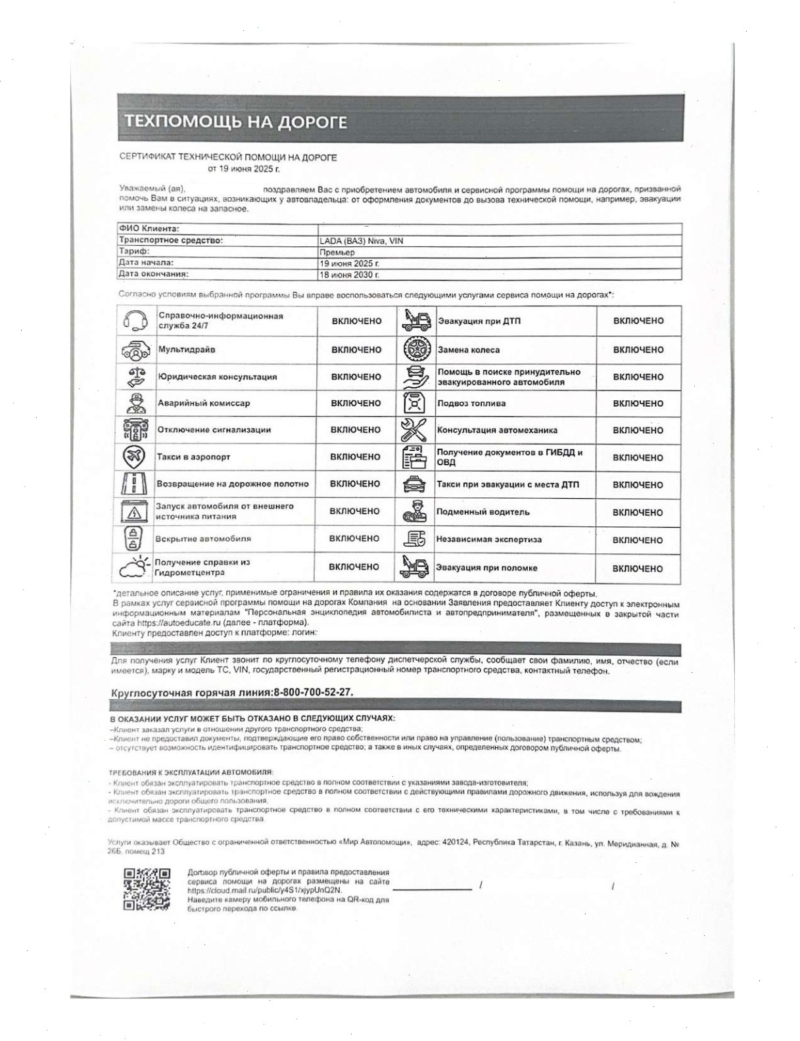 Сертификат техпомощи от ООО “Мир Автопомощи” обычно включает: