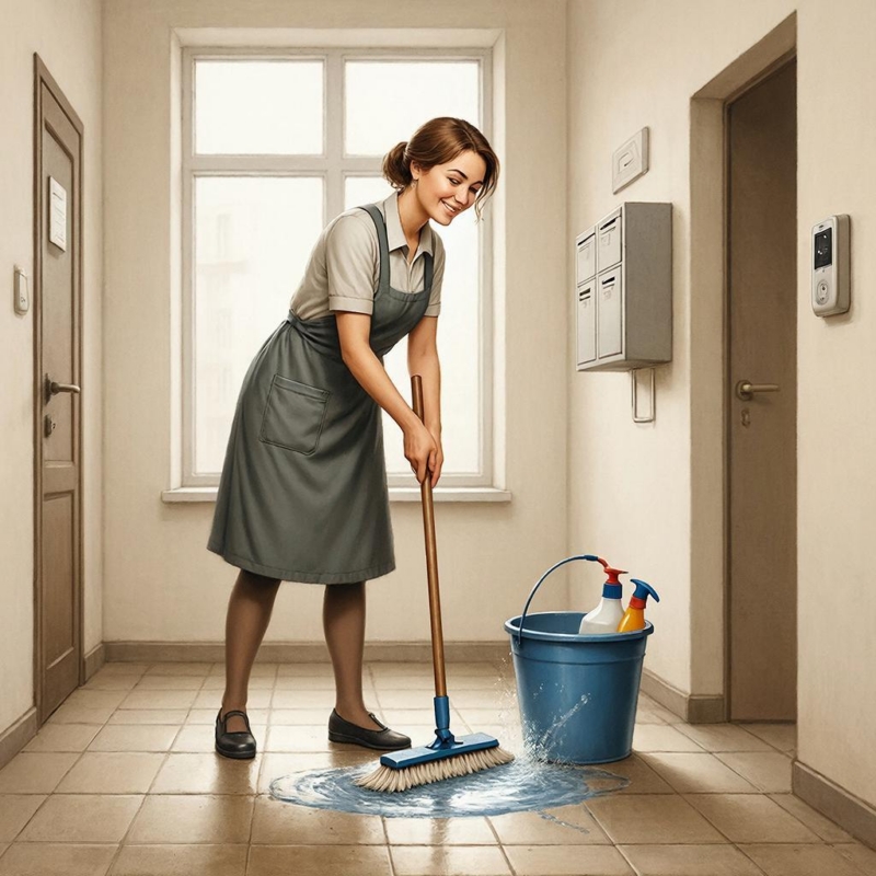 – Влажное подметание: нижних 2 этажей — ежедневно, выше 2 этажа — еженедельно.