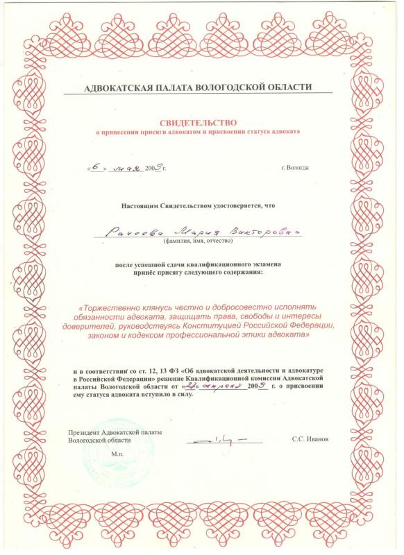 Являюсь членом Адвокатской палаты Вологодской области с 2009 года.