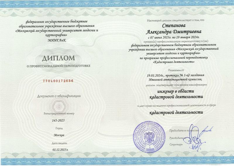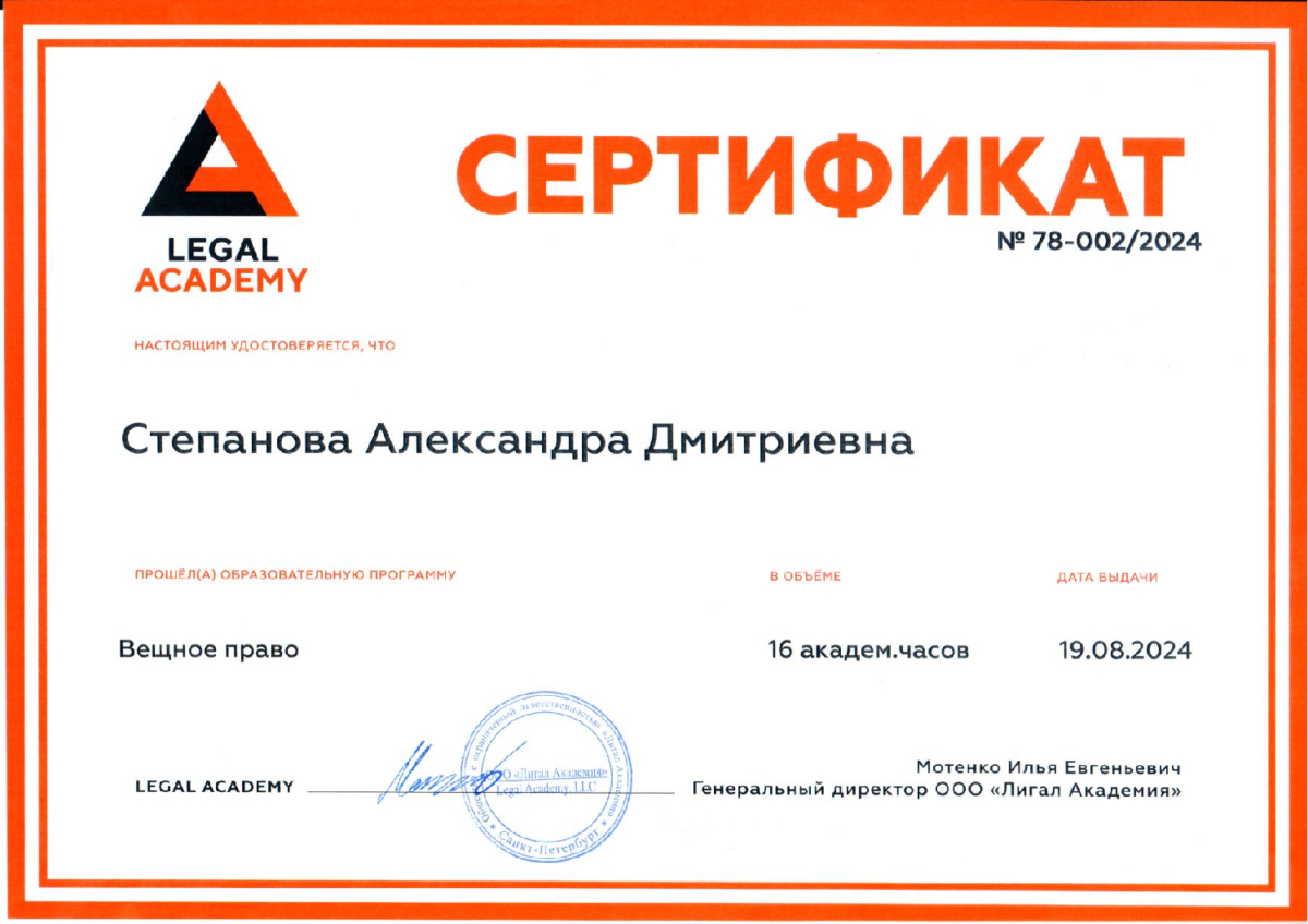 Здравствуйте! Меня зовут Александра Степанова, я юрист с сфере недвижимости и земельном праве. Уже более семи лет я занимаюсь решением сложных земельных вопросов, юридическим сопровождением сделок с недвижимостью и оформлением прав собственности. Также я провожу проверку недвижимости перед покупкой или продажей и предоставляю письменные отчеты. Лично сопровождаю клиентов от первого звонка до достижения результата. Я работаю по всей России. Если у вас есть вопросы, вы можете связаться со мной через Telegram или WhatsApp по телефону: +7(921) 235-10-25, с 09:00 до 19:00. Я могу помочь вам в следующих вопросах: - Консультации по земельному праву и вопросам недвижимости; - Сопровождение сделок купли-продажи квартир и участков; - Проверка юридической чистоты недвижимости перед покупкой; - Разрешение споров по границам земельных участков, конфликтов с соседями и случаев самозахвата; - Обжалование отказов ОМСУ и Росреестра; - Оформление земельных участков и прав собственности.