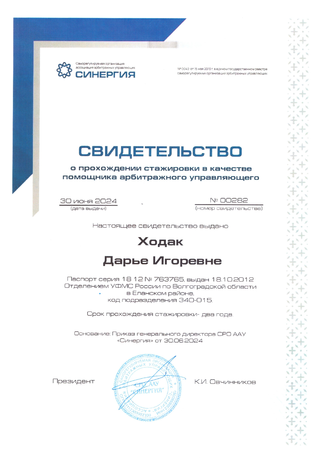 Арбитражный управляющий. Высшее образование, Юрист по специальности «Юриспруденция» Волгоград федеральное государственное автономное образовательное учреждение высшего профессионального образования «Волгоградский государственный университет» 2013г. ОЧУВО «Международный юридический институт» Федеральная служба государственной регистрации, кадастра и картографии (Росреестр) – Свидетельство о сдаче теоретического экзамена по единой программе подготовке арбитражных управляющих 2022г. Стаж - специалист по юридическому сопровождению клиентов – более 10 лет. Экспертно-аналитические функции в области финансов/юриспруденции. Знание законодательства РФ в сфере взыскания, гражданско-правовой специализации.