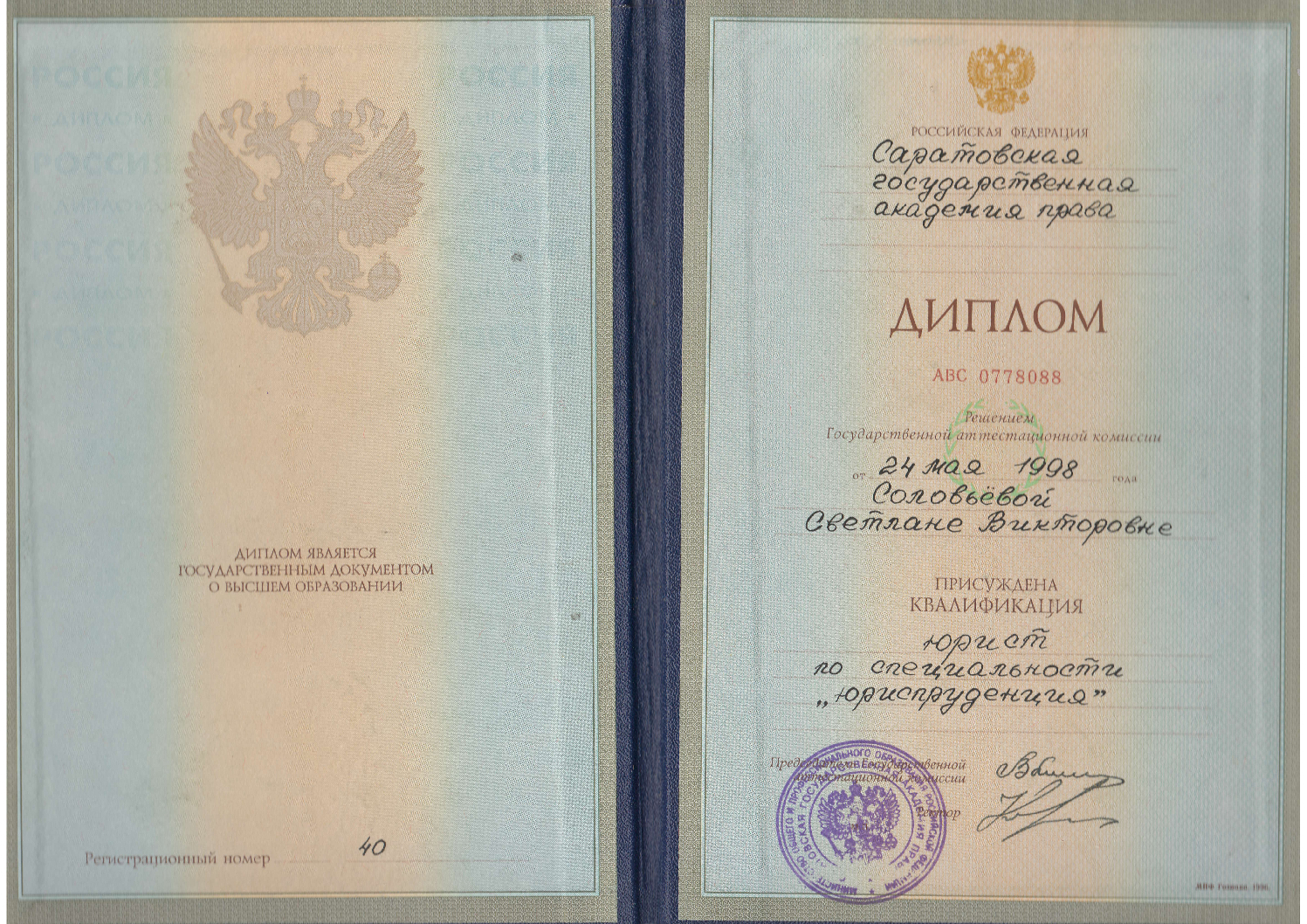 Светлана Викторовна Соловьева — профессиональный юрист с 25-летним опытом в решении сложных задач для бизнеса. Специализируется на правовом сопровождении коммерческой деятельности, судебных спорах и превентивной защите от рисков. Окончила Саратовскую государственную академию права в 1998 году по специальности «Юриспруденция».