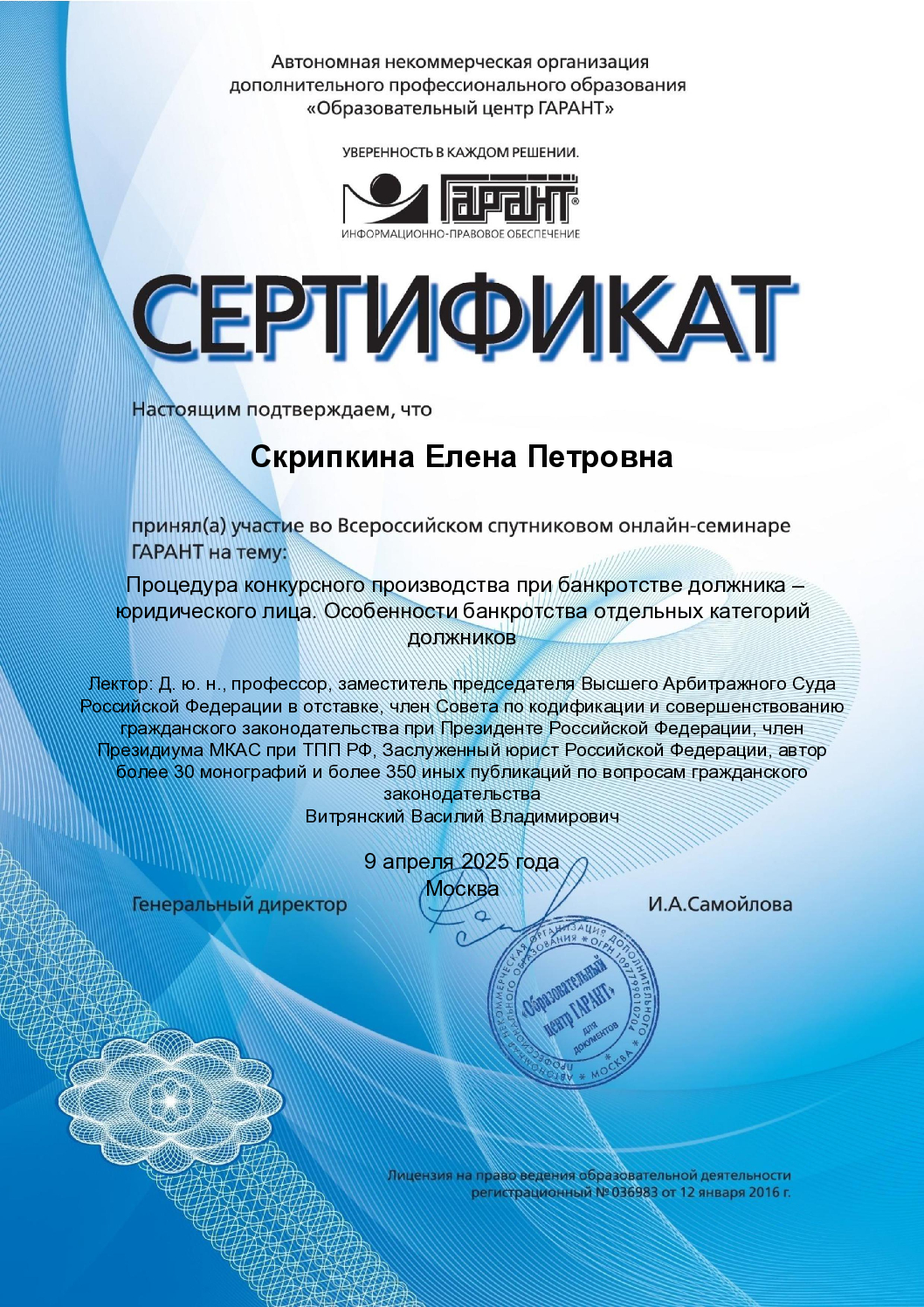 Специализация адвоката: - ведение уголовных дел различной степени сложности в том числе дела, связанные с условно-досрочным освобождением и др. - дела об административных правонарушениях - ведение наследственных дел в суде - представление интересов доверителя в судах по трудовым спорам - ведение семейных дел в суде - ведение иных гражданских дел: оспаривание и расторжение сделок с недвижимостью, взыскание задолженностей и т.д. - ведение экономических дел, вытекающих из гражданских правоотношений, подсудных Арбитражным судам РФ. - составление и юридический анализ гражданско-правовых договоров, в том числе купли-продажи, ренты, подряда и других. - юридическое сопровождение на всех этапах процедуры банкротства