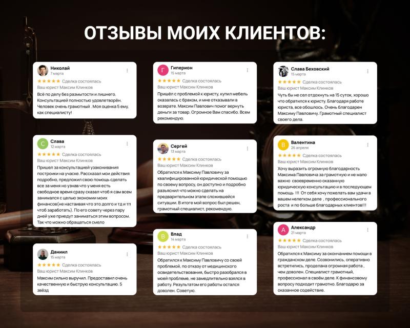 Мы поможем Вам: 💵 Получить страховую выплату в полном объёме (под ключ); 🏦 Снизить кадастровую стоимость; 📋 Оспорить административный материал (есть практика возврата В/У при управлении в состоянии опьянения); 📦 Разрешить споры по Защите прав Потребителей; 💸 Провести процедуру банкротства физического или юридического лица; ⚖️ Получить юридические услуги иного характера. Подробную информацию Вы можете получить позвонив нам ☎️