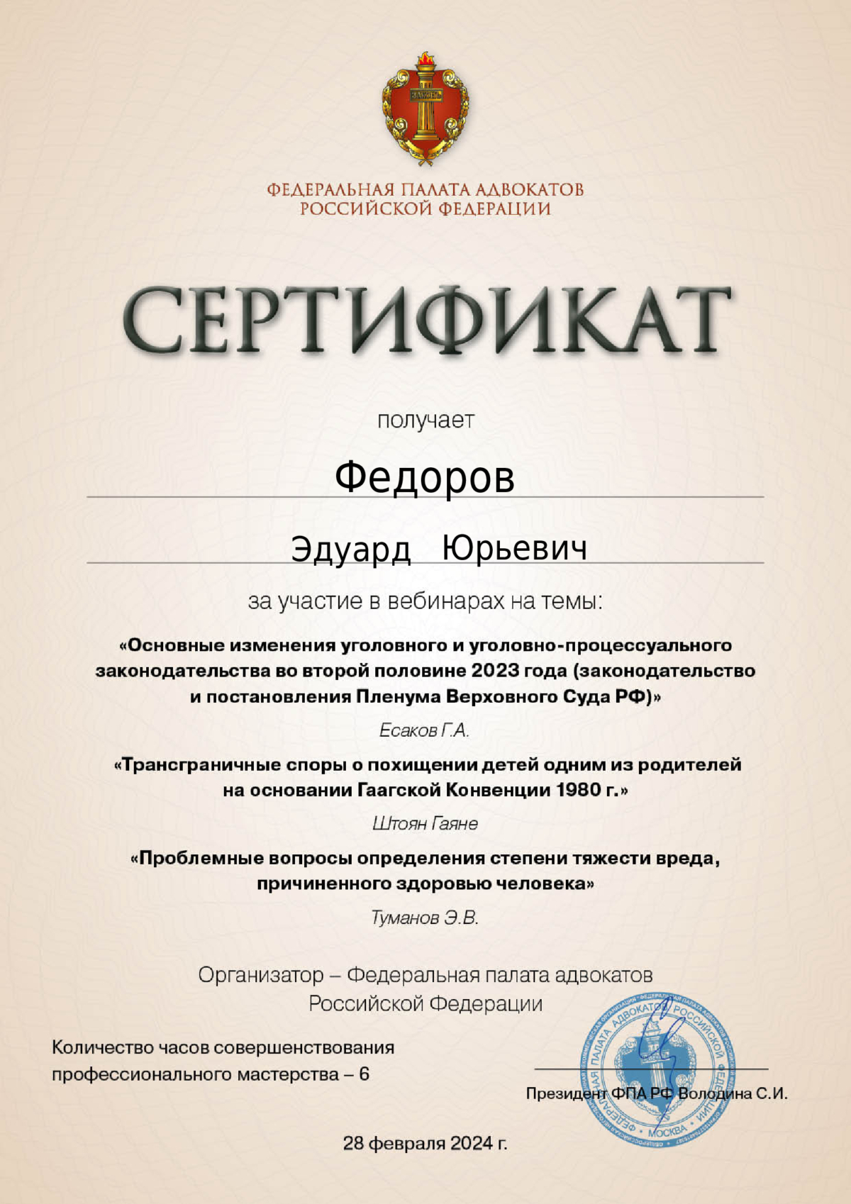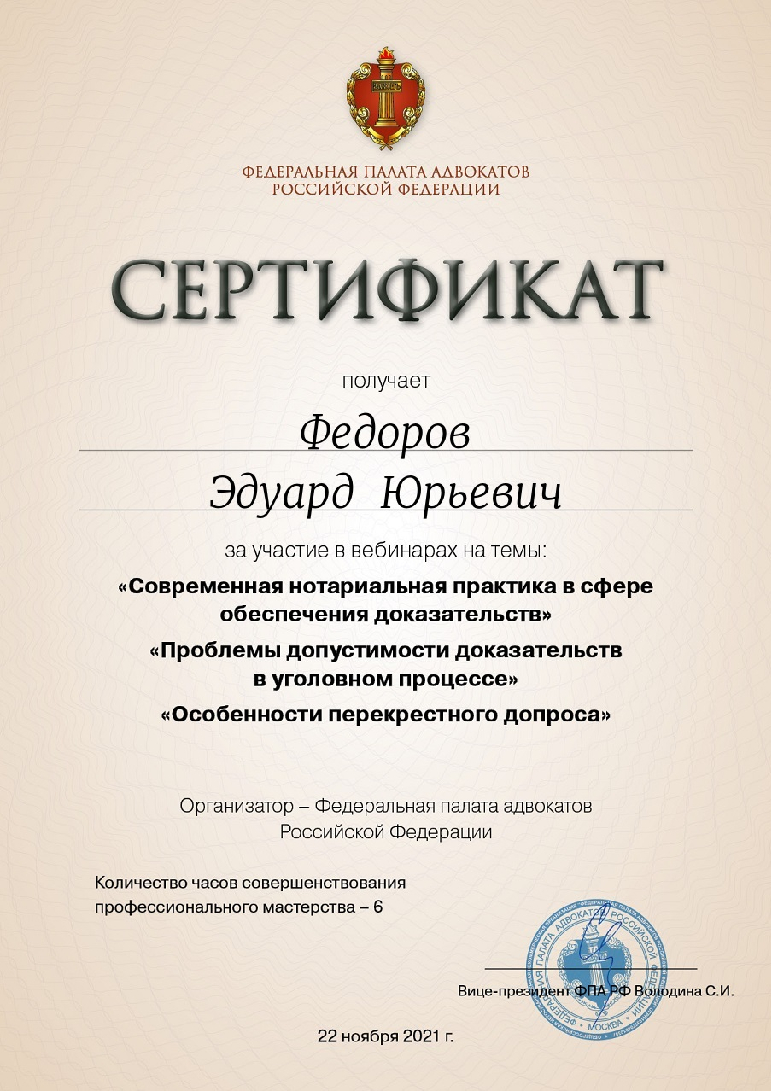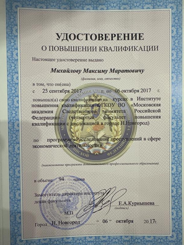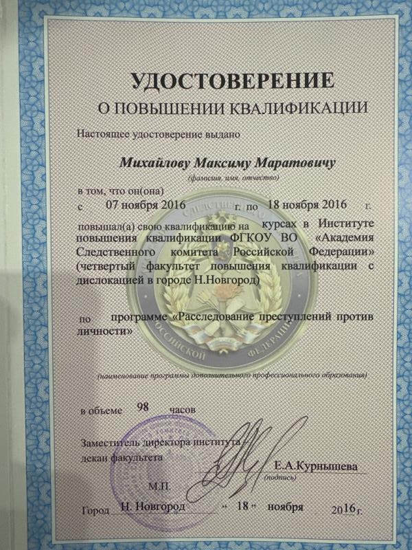 Трижды проходил курсы повышения квалификации в Академии Следственного комитета Российской Федерации. На системной основе принимаю участие в мероприятиях по совершенствованию профессионального мастерства, проводимых Федеральной палатой адвокатов Российской Федерации.