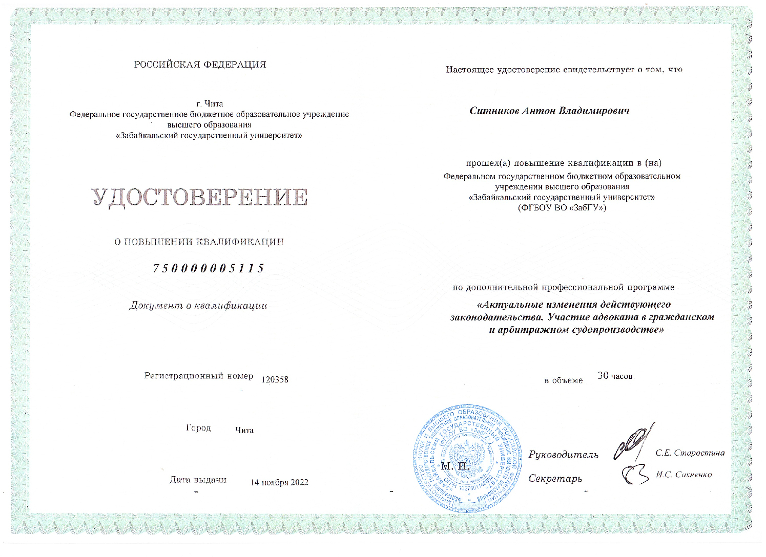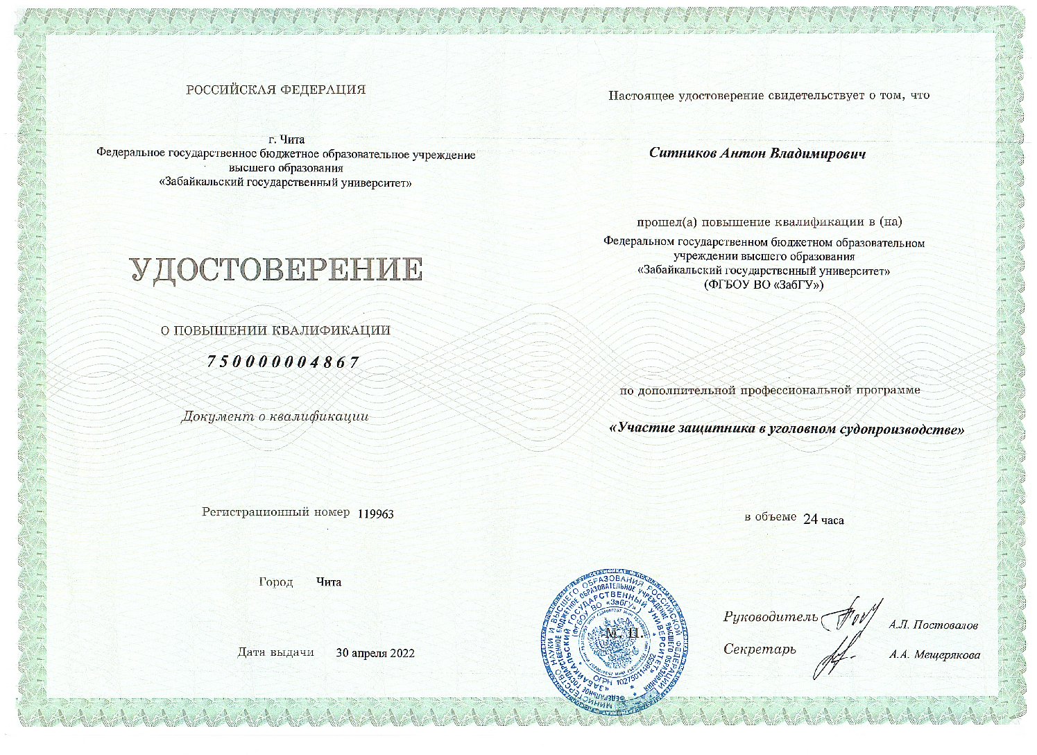 Здравствуйте! Меня зовут Антон Владимирович, я адвокат – учредитель Коллегии адвокатов № 2 Забайкальского края, имею 19 летний юридический стаж и опыт. Специализируюсь на оказании юридических услуг включая: уголовные, административные и гражданские дела. Большой опыт работы в правоохранительных органах, поэтому знаю систему (судебную и правоохранительную) изнутри, в связи с чем моя работа (представительство или защита) является продуктивной.