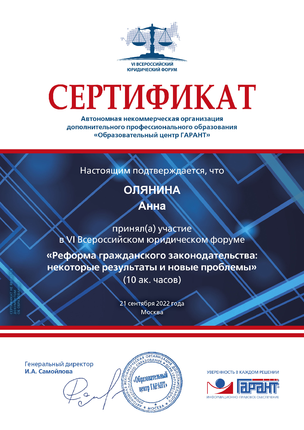 Квалифицированный юрист в области гражданского права с 12-летним стажем. Имею опыт работы в качестве муниципального, государственного гражданского служащего, а также юристом в единственном лице в коммерческих организациях. Кроме основных мест работы, с целью разностороннего развития, повышения квалификации, всегда занималась частной судебной практикой (опыт ведения дел, участия в судебных заседаниях, в Арбитражных судах, судах общей юрисдикции - с 2012 г.), кроме того, совершенствовала знания в такой подотрасли гражданского права как корпоративное право (опыт регистрации, внесения изменений, ликвидации ООО и НКО - с 2018 г.).