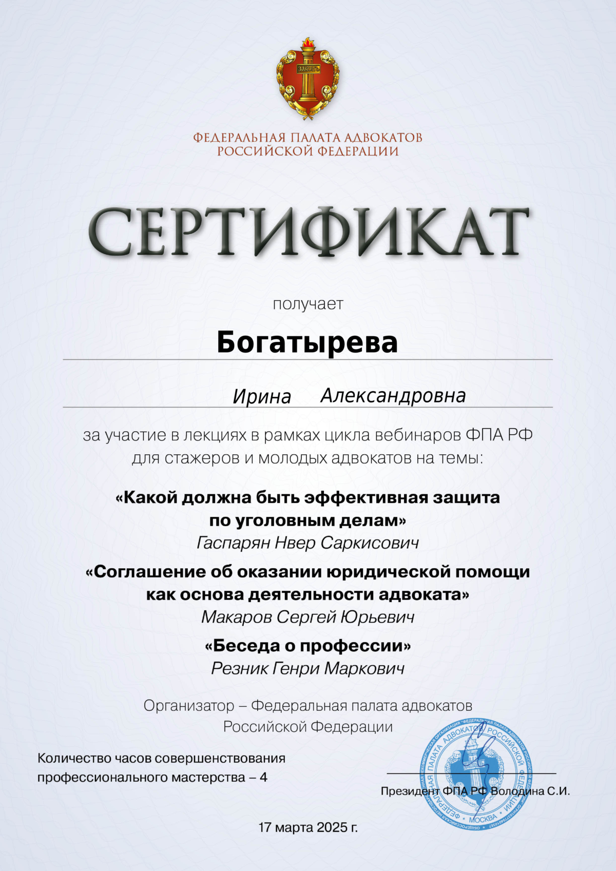 Богатырева Ирина Александровна является практикующим адвокатом со стажем юридической работы 17 лет, включая стаж работы в правоохранительных органах. Специализируется на оказании юридической помощи как в рамках уголовного судопроизводства, так и гражданского, в том числе: в разрешении семейных, договорных, жилищных споров, споров по обязательствам, возникающим из причинения вреда. Адвокат отдает приоритет уголовным делам по преступлениям в сфере экономической деятельности, преступлениям коррупционной направленности, преступлениям против конституционных прав и свобод человека и гражданина, против жизни и здоровья, преступлениям против семьи и несовершеннолетних, в сфере оборота наркотических средств.
