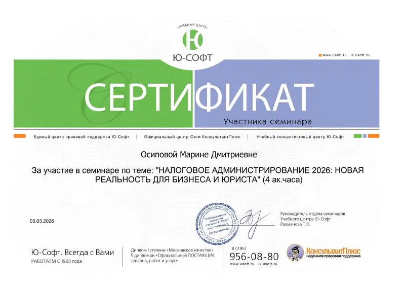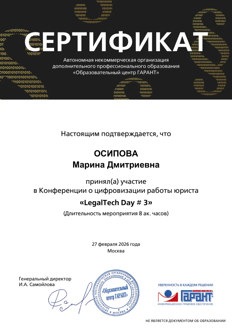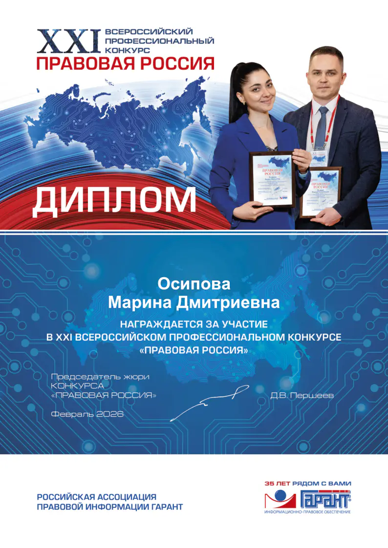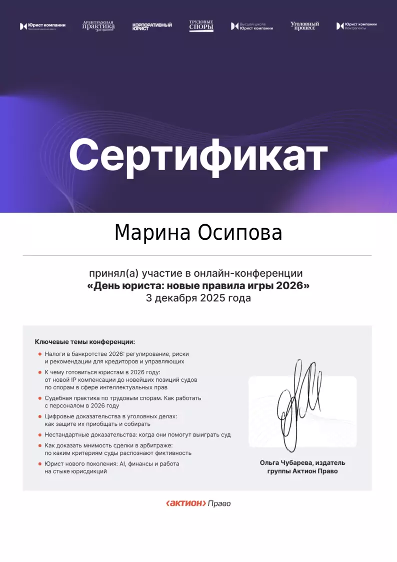 Список судебных дел в карточке юриста может быть не полным и зависит от того, указан ли юрист Осипова Марина Дмитриевна в деле или нет