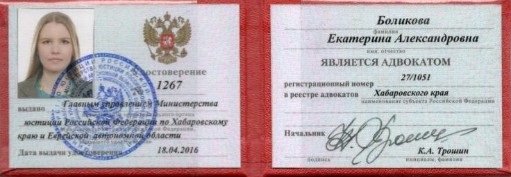 Боликова Екатерина Александровна - адвокат в Хабаровске, Хабаровский край, со стажем более 12 лет, указано 45 судебных дел, рейтинг 5.5, 1 отзыв. Режим работы: будни 9:00-18:00. Email: khabarovsk27@mail.ru.