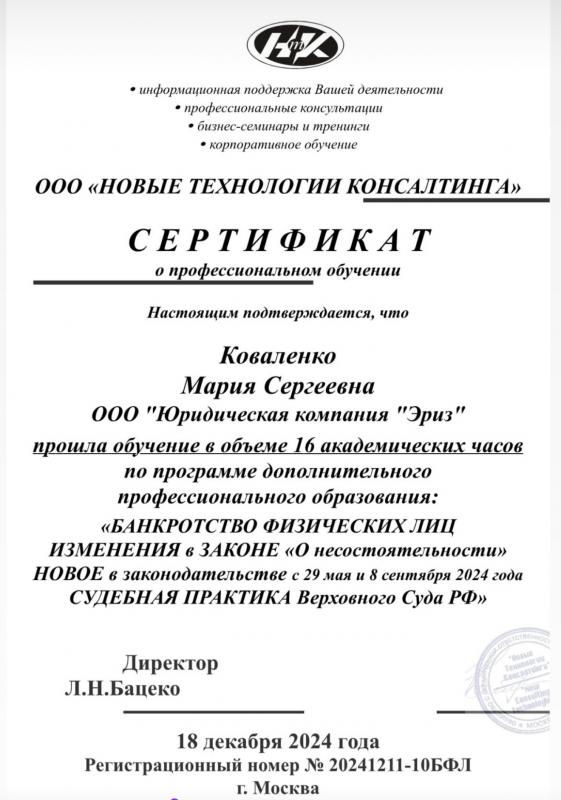 Список судебных дел в карточке юриста может быть не полным и зависит от того, указан ли юрист Коваленко Мария Сергеевна в деле или нет
