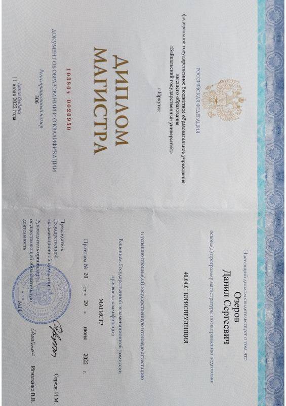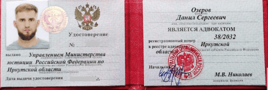 Здравствуйте, уважаемые клиенты и доверители! Меня зовут Озеров Данил Сергеевич, я являюсь членом адвокатской палатой Иркутской области адвокатом Прибайкальского правового центра Иркутской областной коллегии адвокатов, номер 38/2032 в реестре адвокатов Иркутской области. 💼 Я имею более 5 лет опыта юридической деятельности и готов оказать высококвалифицированную юридическую помощь. 💼Ранее длительное время работал в Следственном комитете Российской Федерации по Иркутской области, на различных должностях в том числе в должности старшего следователя по расследованию особо важных дел. 💼 Я специализируюсь на работе по уголовным делам, защите прав и интересов в ходе предварительного расследования и в суде, в самых сложных ситуациях. Однако я также оказываю юридическую помощь по семейным делам. ⚡Вот почему Вам стоит обратиться именно ко мне: ✅ Оказываю юридическую помощь по уголовным и семейным делам любой сложности. ✅ Предоставляю честную и объективную оценку перспектив исхода дела в вашей ситуации и не даю обещаний. ✅ Осуществляю срочный выезд к Доверителю в любое время суток. ✅ Осуществляю активный сбор доказательств по уголовному делу. ✅ Работаю строго по соглашению, которое учитывает интересы доверителя. ✅ Обоснованные цены за юридическую помощь, которые строго закреплены в Соглашении. ✅ Все доверенные вами сведения являются конфиденциальными и защищены адвокатской тайной с момента обращения за юридической помощью. ✅ Индивидуальный подход и внимательность (полностью погружаюсь в проблему, согласовываю основные действия и позицию по делу, поддерживаю контакт и информирую о ходе дела) ✅ Я готовы принять вас у себя в офисе или составить документы онлайн. ✍ Я специализируюсь на защите подозреваемых, обвиняемых, подсудимых и свидетелей, а также представлении потерпевших по уголовным делам на стадии предварительного расследования и в суде. ⚡Не откладывайте решение своих юридических вопросов на потом, с каждым днем решить ваш вопрос становится все сложнее, а некоторые ошибки становиться невозможно исправить. 📞Звоните мне прямо сейчас, и мы договоримся о встрече, на которой обсудим Вашу ситуацию!